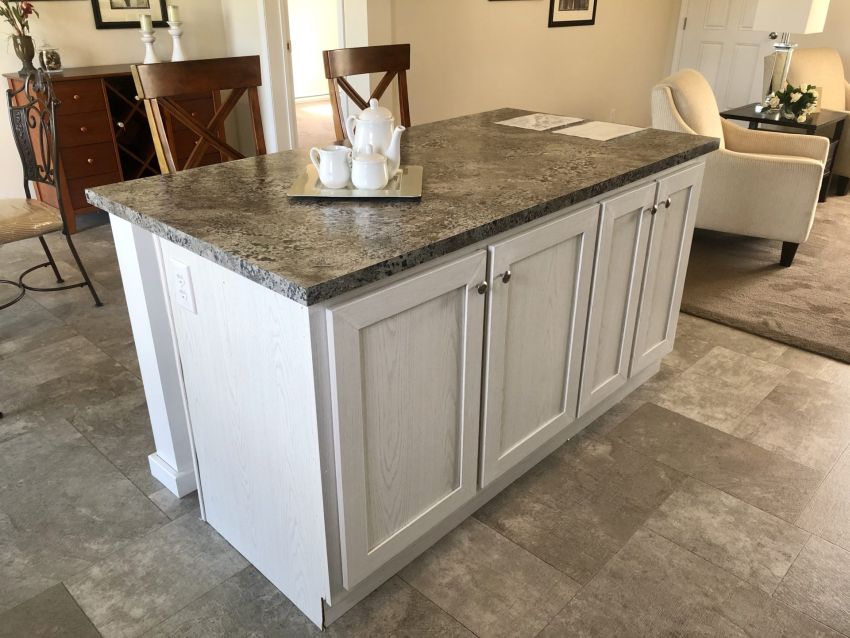 This has a pretty large island plus a dining area. You can put a patio door in the dining area. There is room for a small freezer in the utility room next to the washer dryer. The maser bath is on the small side.